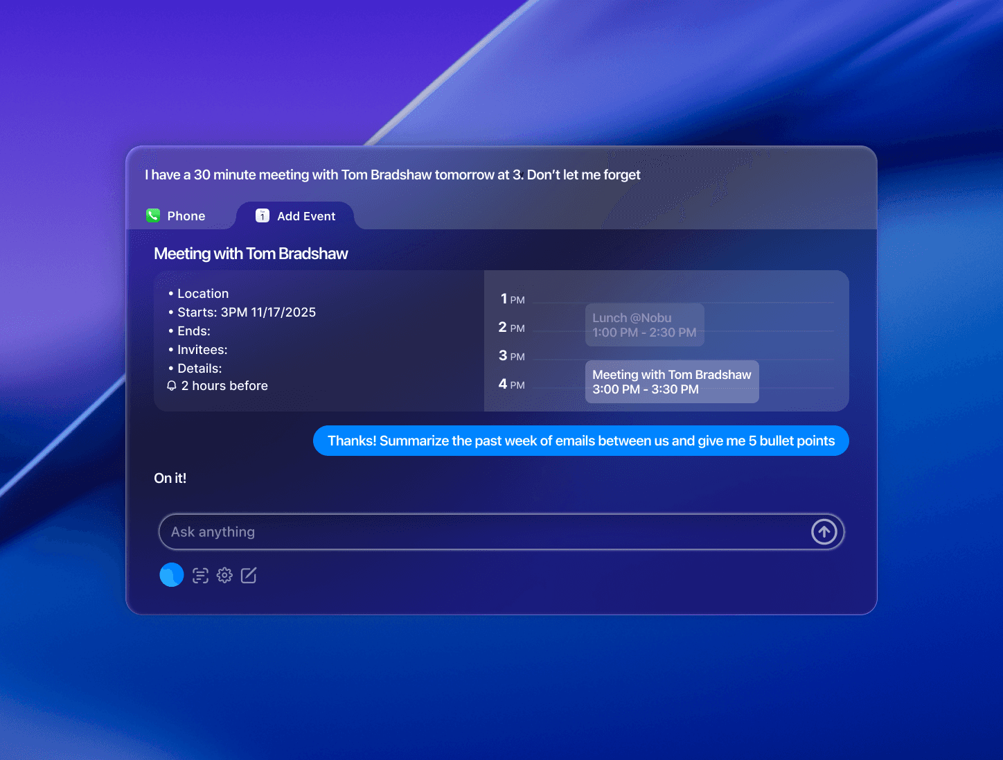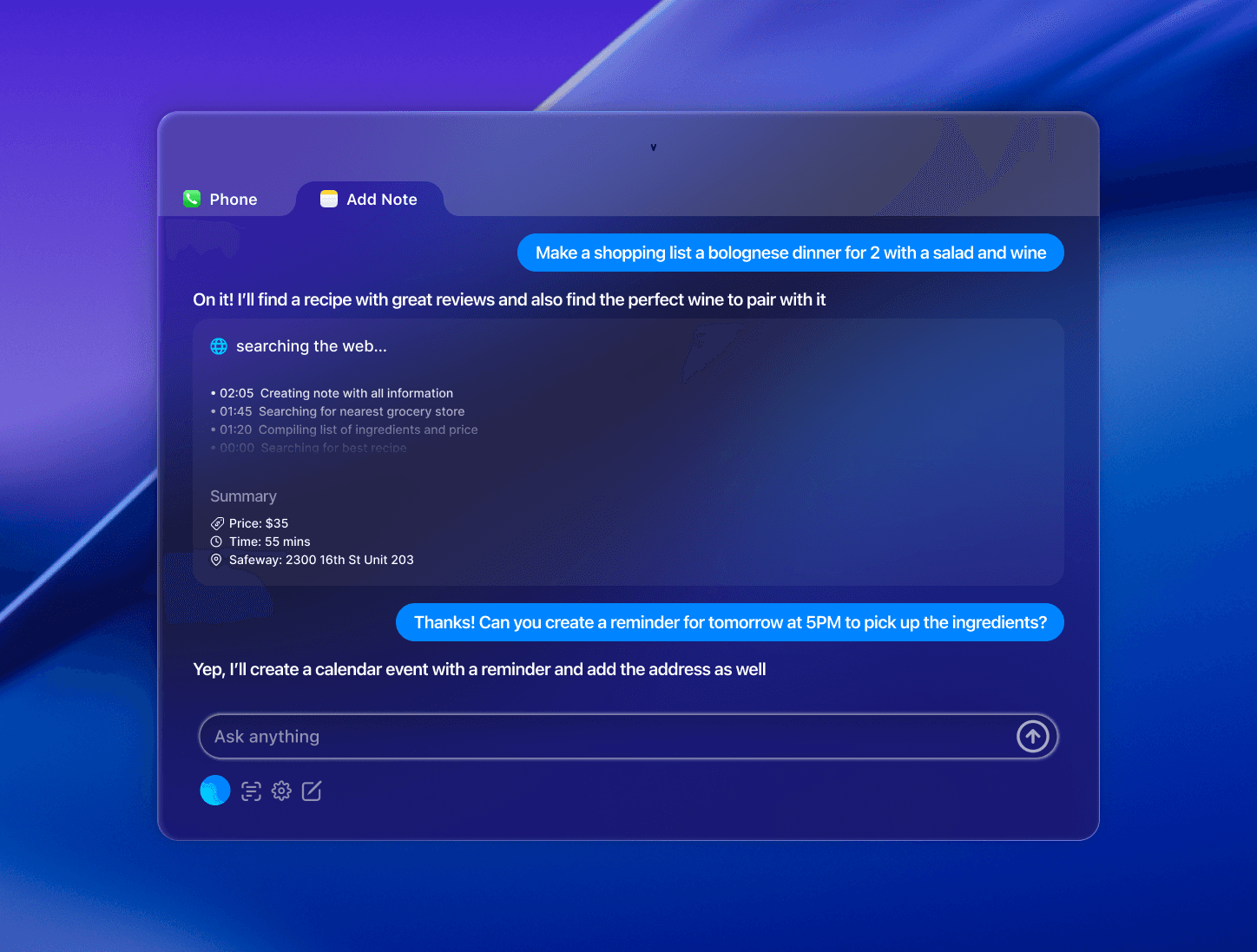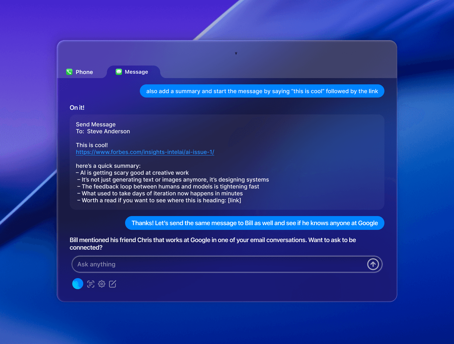 Air reimagines macOS productivity by controlling all apps from a single interface. Instead of switching between Messages, Calendar, Safari, and Notes, users describe what they want to accomplish and Air orchestrates everything in the background like sending messages, scheduling events, conducting research, and even making calls to book appointments.